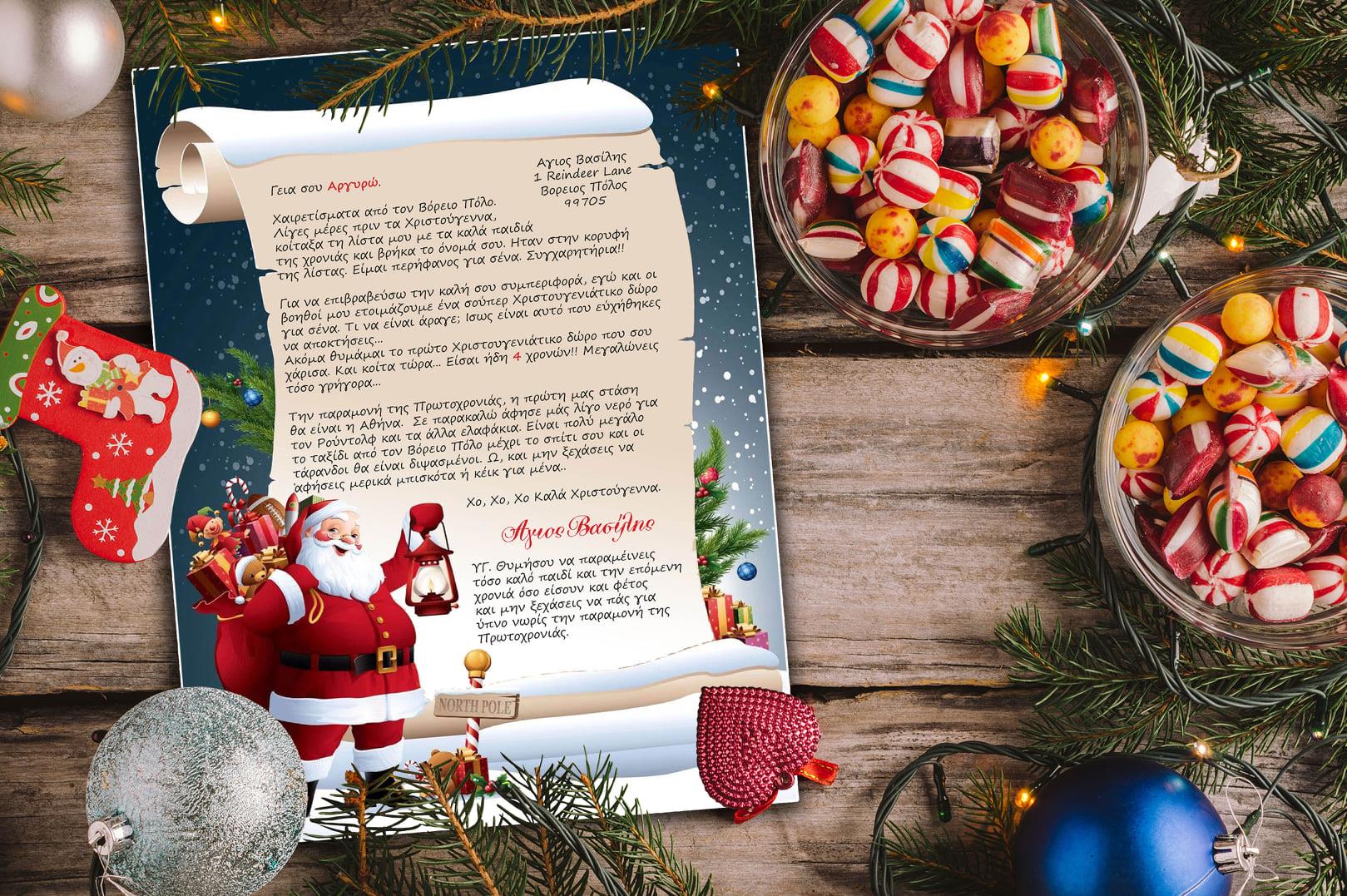 Χαρίστε και εσείς στα παιδιά σας χαμόγελα με μια προσωποποιημένη επιστολή από τον Άγιο Βασίλη, που γράφτηκε ειδικά για το παιδί σας. Εκτυπώνεται σε χαρτί υψηλής ποιότητας, απευθύνεται απευθείας στο παιδί σας και παραδίδεται σε εορταστικό φάκελο.